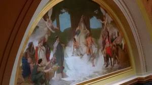 The first picture is from the Rotunda ceiling – the main entrance and focal point of the Capitol. Mr. Jacobs explained the depiction of manifest destiny, of the white male figure driving savagery from the land. He is led by angels – implying that he is being led by God to take the land from the current inhabitants. He is driving away a bear, a cowering mountain lion, a naked woman with the head of a fox and a brown-skinned man.