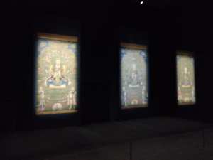 The penultimate room was full of jade and lacquer and an intricate silk tapestry. There was a scene documented the lives of the monks who had reached Nirvana. The colors of the tapestry were woven into the cloth. The jade sculptures were scenes – like from a mountain side and the wallpaper in the room mirrored the mountains except they were urban, not pastoral, in nature. There were like castles from afar but up close more like urban decay.The final room is a blast of bright light.