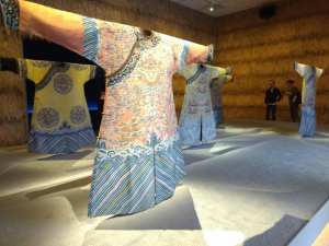 The next room contains a series of ceremonial robes – all gorgeous. Again with a soundtrack that synced with lights that left ominous shadows from the robes and a smell of lemongrass that matched the straw on the walls. The next room is dark, bluish with one little bronze man. Strike that, one tiny man in a museum display pedestal. It was very calming. The next room is reminiscent of a Chinese antechamber. There was bed and items that you might find in a bedroom or antechamber. But most striking was the tin foil (OK maybe Mylar) crinkled all over the walls. As a kid I used to make doll houses in shoe boxes, including adding wallpaper to the walls – usually from toilet paper. This was like that – only well done and much cooler.