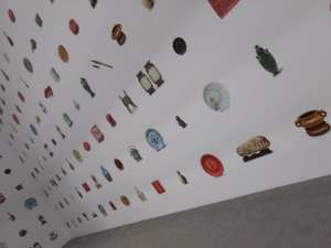 The first room is a dark meditation – literally. It’s a ticketed and timed event and so as a cohort a number of us set out into the room for 5 minutes. There are some funny dropping, crashing sound effects – but otherwise it’s dark. Dark like wondering where the rest of the people are. It sets a somber tone – which is immediately broken in the next room focused on prosperity. It’s a collection of items on shelves accompanied by items on the wall paper – some of the same items but not all. (I had some time to double check.) There was an outdoorsy smell and soundtrack that reminded me of Bozo the Clown. It was like party whistles.