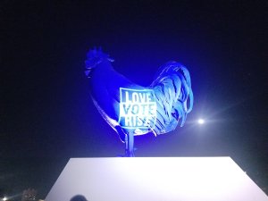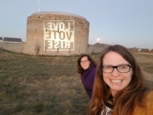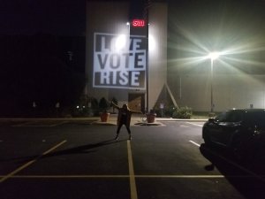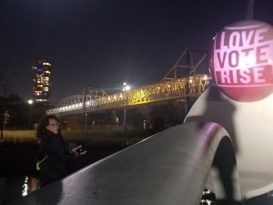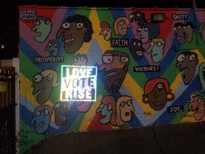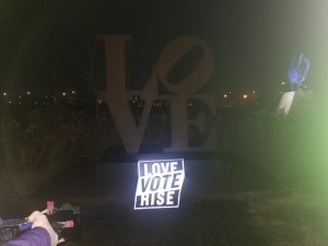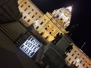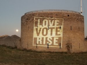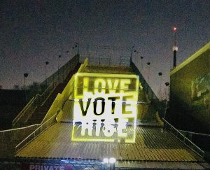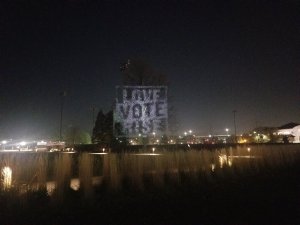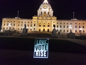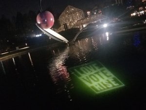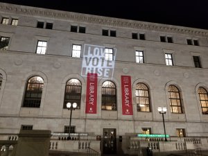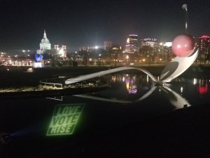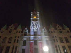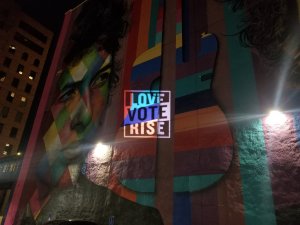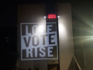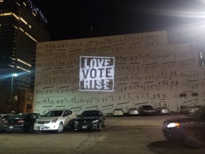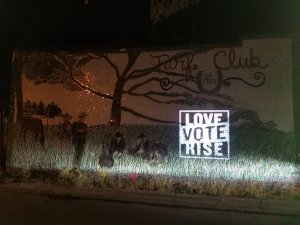 Love Vote Rise is a social justice, community-spread art installation that aims to encourage voting. It’s a one-two punch of posters, which I helped deliver two weeks ago. And a light installation. Big news! Monica Nilsson and I got our hands on a LVR projector last night and we got to run around town doing light installations. We started about 6pm, stopped for dinner but went until almost midnight. It was so much fun – and so cold and night is darker than you might remember.