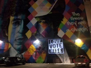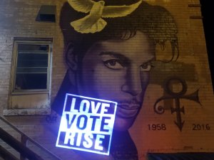 A quick pic at the Prince mural on 26th and Hennepin in Uptown. Painted by local artists, Rock “Cyfi” Martinez, painted to help Minneapolis get its mojo back after the death of Prince. Seems like we could use a few more murals now – or better yet, we could use some votes to effect change!
