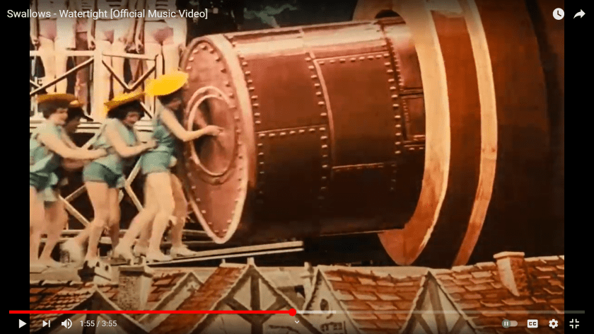 Watertight has a steampunk sound. There’s a mechanical clink to the music like the sound of cogs in a machine going round and round. It’s that almost onomatopoeia sound of “slow moving, still water…” drudging into greater depths offset by the perfectly misplaced clink. The video complements the music with quirky vintage video of people making things that look like they’ll never work. It’s very retro space age or picture low budget Wizard of Oz 2.0. It’s captivating.