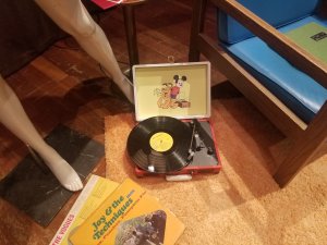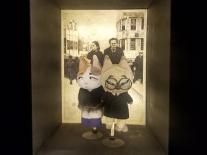Two of the artists (Trina Fernandez and Jocelyn Suzuka) created the feel of a bedroom or other personal space. The patron was invited into the space, to poke around and touch the details of the art. Fernandez’s space feel like an artist’s studio apartment with some amazing paper dresses on mannequins. The piece incorporated music and a record player although the music playing was not the music on the turntable. But it was fun to be up and close to get those sort of details. Suzuka’s space felt like a call back to a child’s room. Visitors were invited to touch, hold and pet the plush animals in the room. It’s an extremely intimate experience to reenact the hug of a childhood memory. Suzuka also shows a photo of her grandparents, who she recreated as stuffed cats. She captures their emotion in an exaggerated cat-way that makes them even more human.
