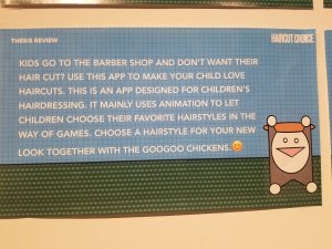 There were pieces that included books, apps and technology. Yao Jian’s drawings have child-friendly quality. They showcase, in a nurturing way, everyday activities that can be fraught with decision and emotions. Zhangruo Sun created an app that keeps kids engaged while they get their hair cut. Awesome! Darren Schneibel has created a satellite and dish along with information on Elon Musk and SpaceX and a condemnation of his use of government money as the second wealthiest person on Earth who is “obsessed with colonizing extraterrestrial locations.” (I felt like I could have added some footnotes to his work, given my day job writing about rural broadband.)