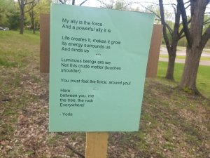 It is a self-guided tour of an area in urban wildlife. Throughout the area is recorded ambient music. It’s gentle and subtle most of the time with just a few sonic surprises to keep me on my toes. There are strolling musicians. There’s poetry and art that incorporates the existing area. There was a lovely poem about a specific tree with an ethos of The Giving Tree. There was a fun photo of the Witch’s Tower (the water tower that inspired Bob Dylan’s All Around the Watchtower), positioned in view of the actual tower. There were dancers in neon; I could watch that all day. There are opportunities for deeper engagement, if you want to go that route.