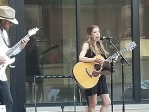 It’s very family friendly. There’s an ice cream shop right there and plenty of places to sit. I got there late and was able to find shade quickly, that might be tougher exactly at 4. The parking was not difficult. There’s no pressure to buy anything. Katy Vernon has curated the lineup; it’s good! Something unique about this series is that each weekly includes a headliner and features a short set from the local emerging (high school!) musician. Tonight Sarah Morris started out the series with Thomas Nordlund. They sounded great. It was wonderful to see her in the flesh after a long break. She has such a nice balance of songs and chat – perfect for the atmosphere.