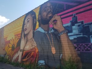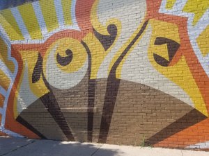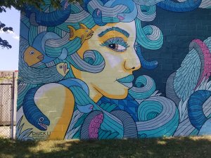 The next three I’m grouping by composition – murals that feature couples. The first is by Reggie LeFlore; his faces bring out the extraordinary of the everyday people. There’s a power and a vulnerability. The second is two bird by Beatrix*Jar, two artists from the area. They are musicians, makers and visual artists. Third we have Xee Reiter and actually this mural isn’t really a couple. It’s maybe a small group or maybe many faces of the same person. It’s very playful.