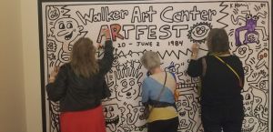 I love The Walker After Hours. It’s a chance to get a sneak peek at an upcoming art exhibit with fancy drinks and fun activities. It’s always a super busy night. Lots of great people watching and some time to check out the art. Last night they unveiled the work of Keith Haring. His work is graphical and colorful. Lots of naked people, and really. I mean men but in playful, humorous ways. He takes on tough subjects like AIDS and anti-Apartheid movements but uses levity, dance and colors to lift the subjects. It feels like a celebration because as the title of the event indicates – Art Is for Everybody.