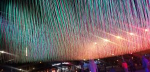 The thermostat says 22 degrees, but “real feel” is 1, but that does not stop us from art mostly outside art adventure! We started our night at the unveiling of HOTTEA’s large scale string street art at 730 East Lake Street in Minneapolis. I am a big fan of HOTTEA. He does yarn-based street art. I can remember years ago happening upon his yarn strung through fences and other public structures in a 3D font fashion. He does this work all over the world now, but he’s back in Minneapolis stringing 9,200 strings from a grid in the sky in different colors, under colored lights left to sway in the wind. This art was created during some super freezing cold days, based on stories from folks in and around Lake Street. Bonus clip of his talking!