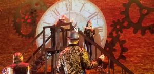The scenery was sparse but effective. There was scaffolding that served the famous balcony; the most prevalent prop was an old fashion clock, like found a vintage town square or the Minneapolis City Hall Clock. The second hand tick-tocks throughout the performance. Sometimes it’s loud; sometimes silent. The pace of the tocks mirrors (or sets?) the pace of the action on stage. Throughout the show, the dancers’ movements in turn mimic the movement of the clock. It’s centering.